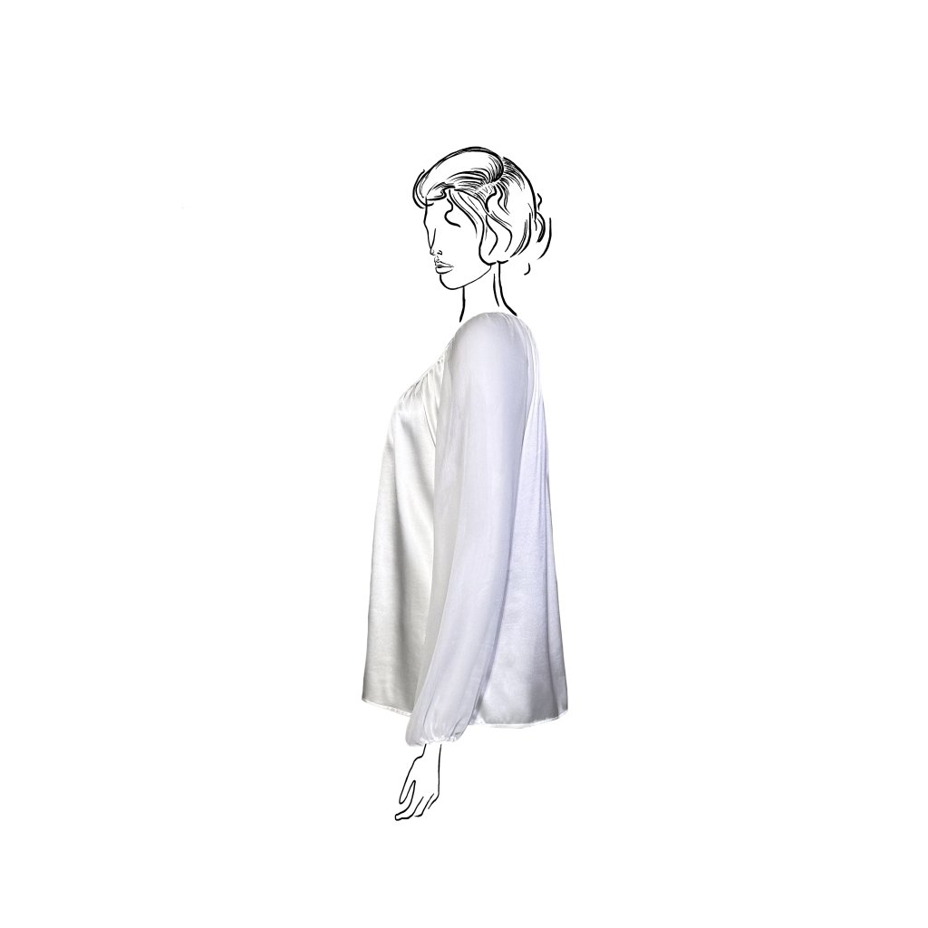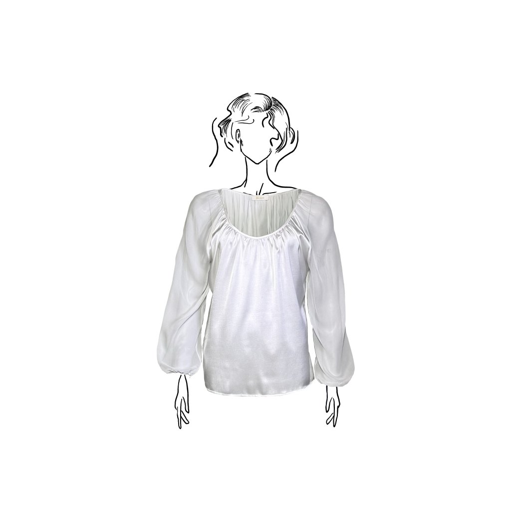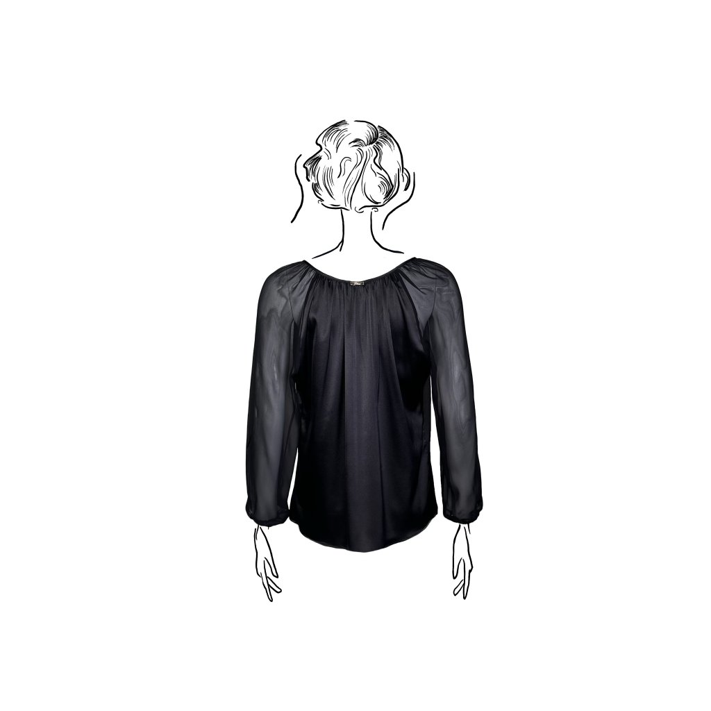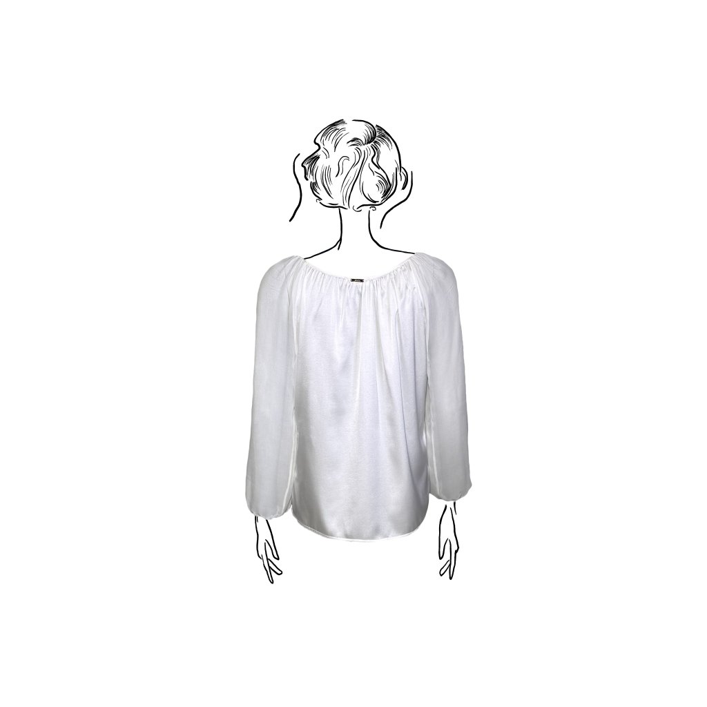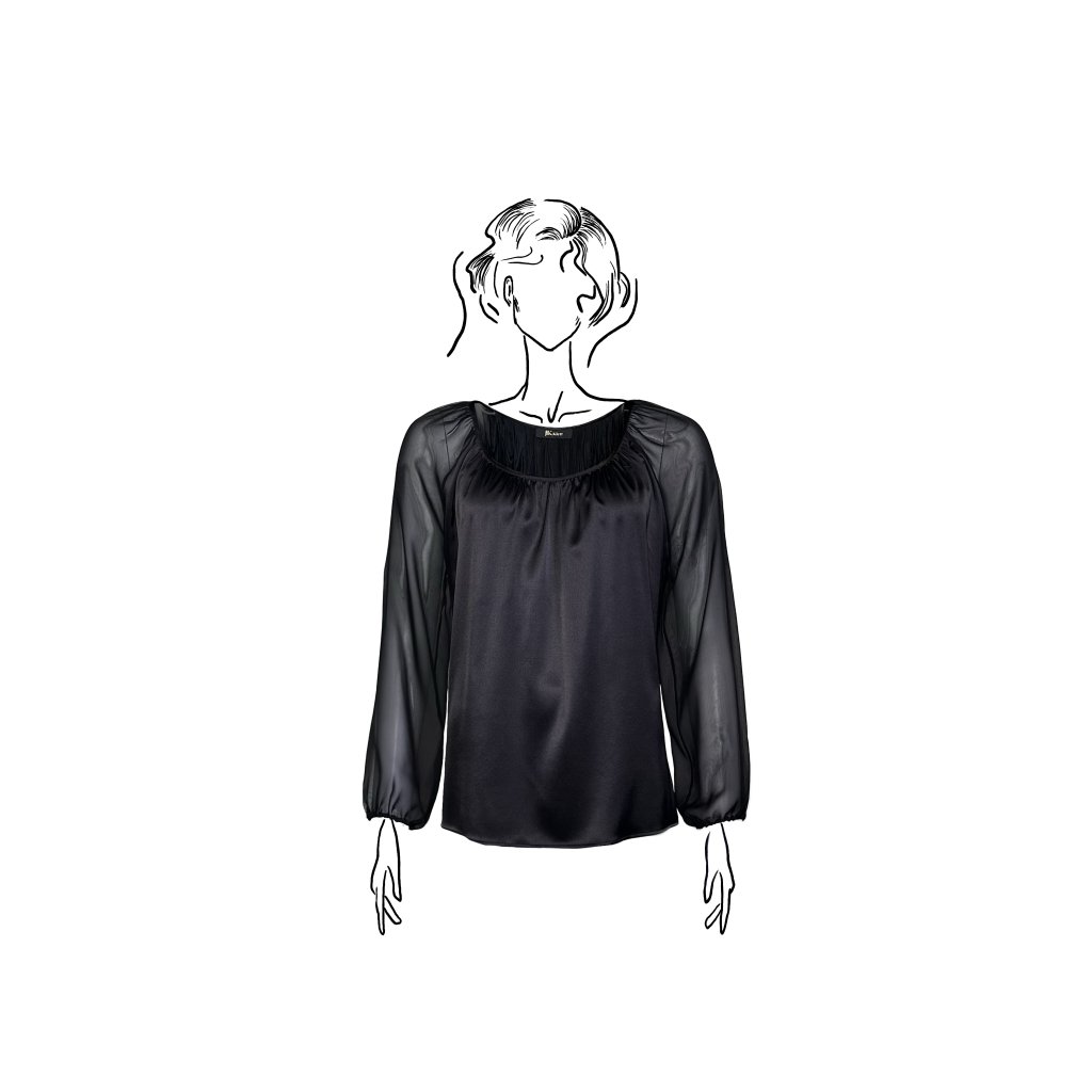Saténové hedvábí v kombinaci s průsvitným šifonem vytváří elegantní kontrast materiálů. Jemně řasený střih kopíruje siluetu a dodává halence lehký, ženský pohyb.