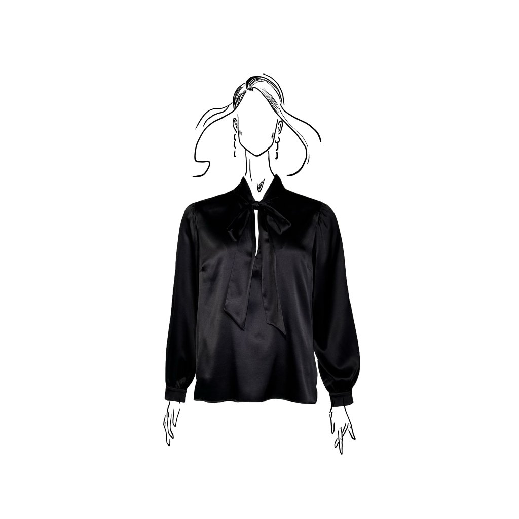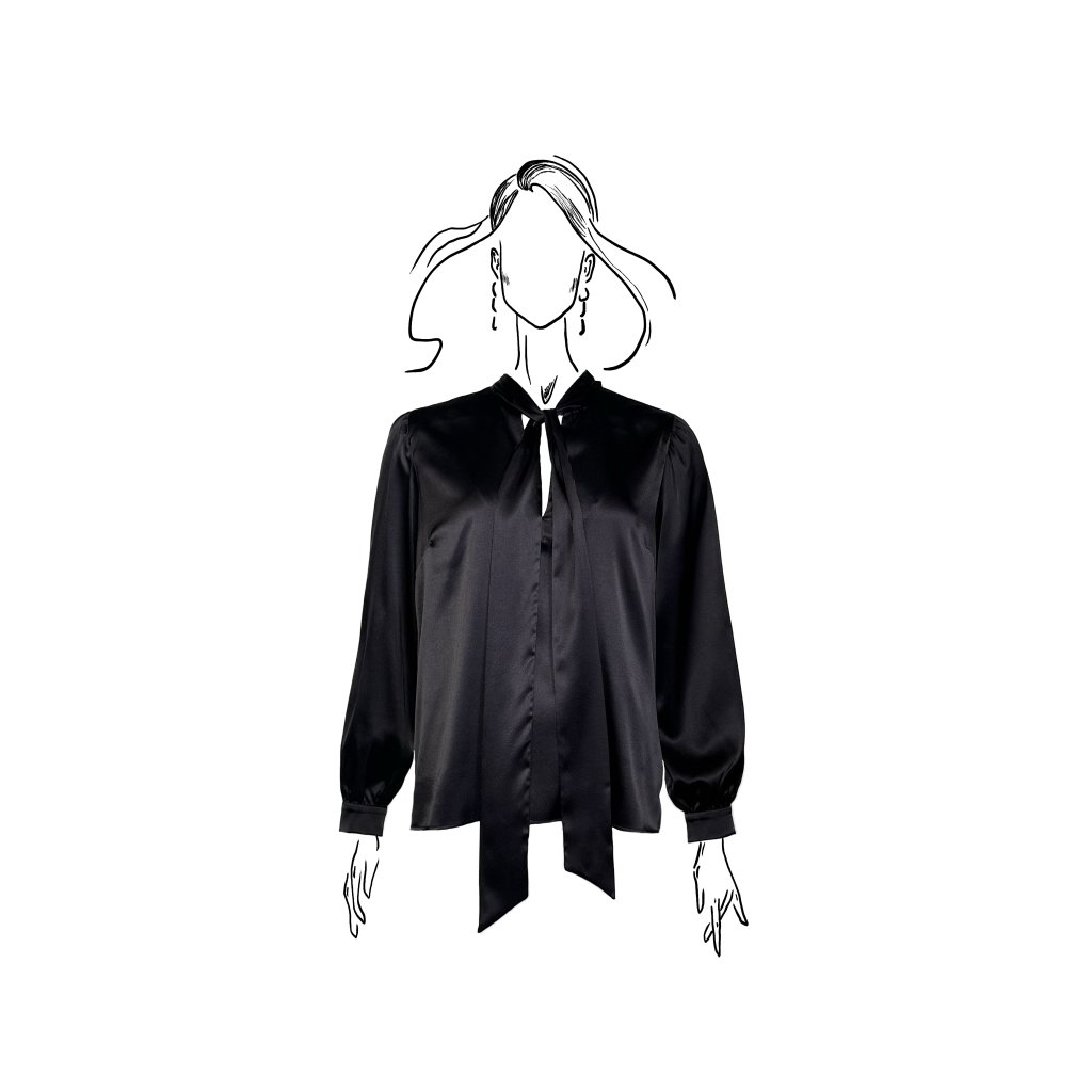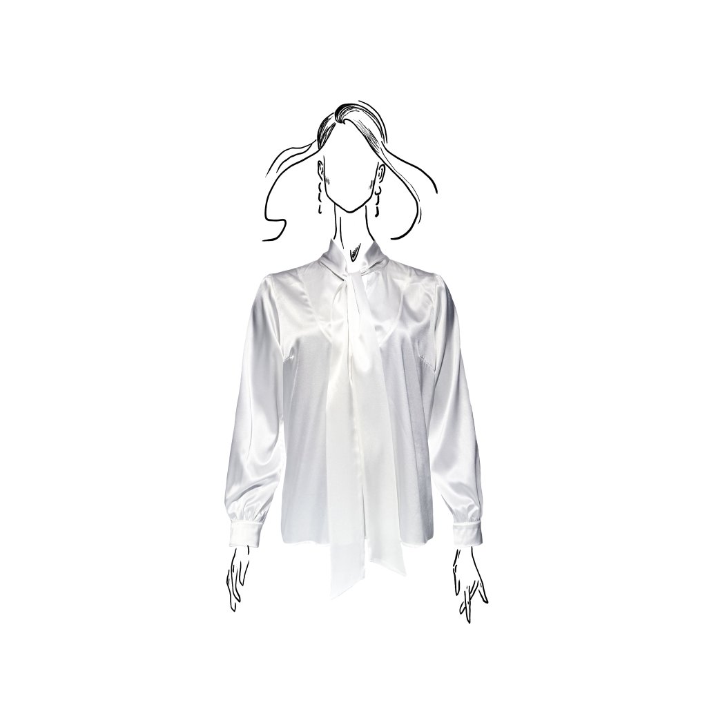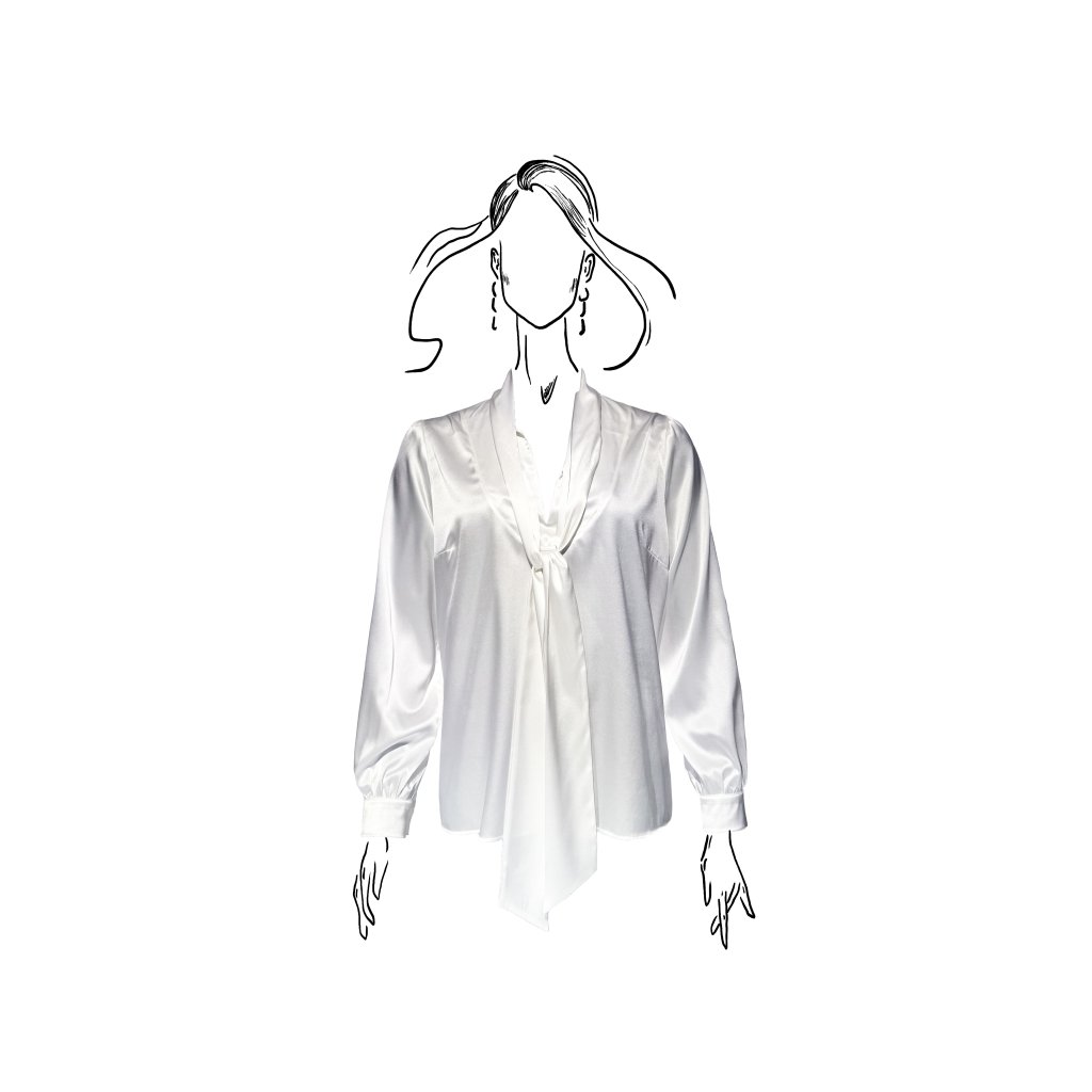 Dlouhé rukávy s jemným zapínáním na manžetách dodávají modelu klasickou eleganci, zatímco saténový materiál přináší lesk a výjimečný komfort. Halenka je dostupná ve dvou barevných provedeních – ikonické černé a čisté bílé, které podtrhují nadčasový charakter celé kolekce.