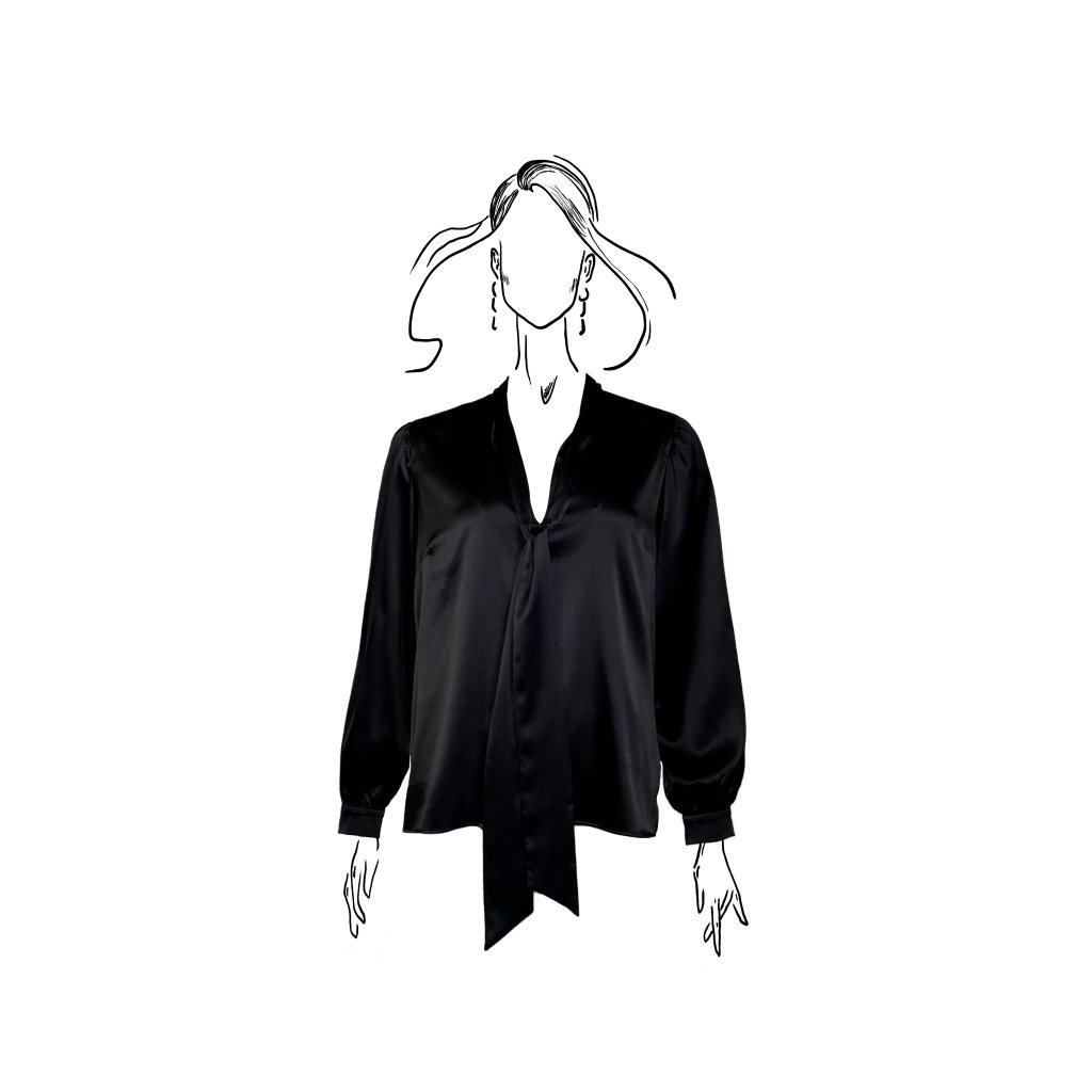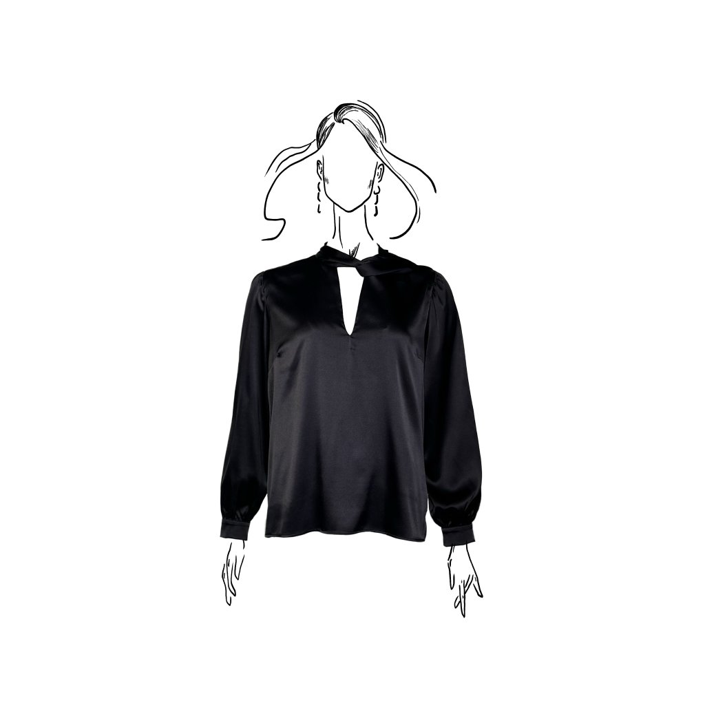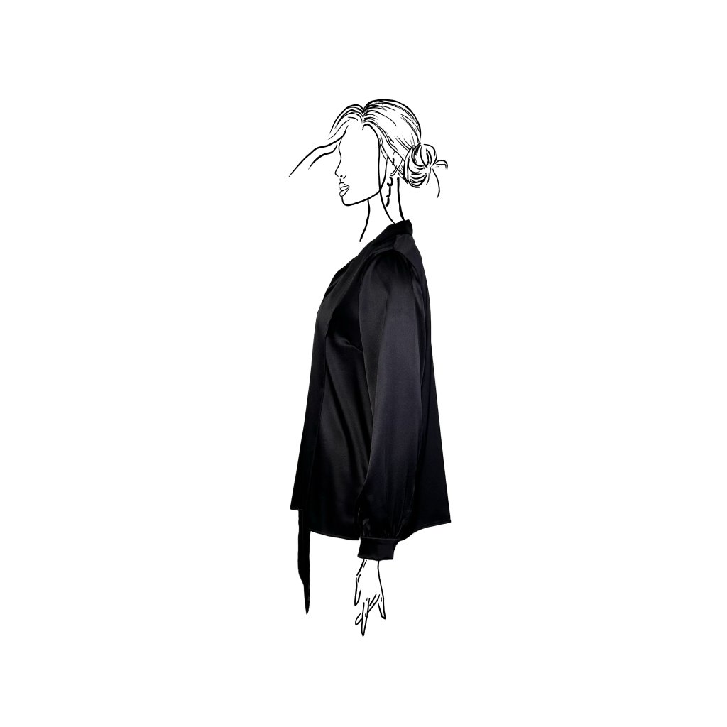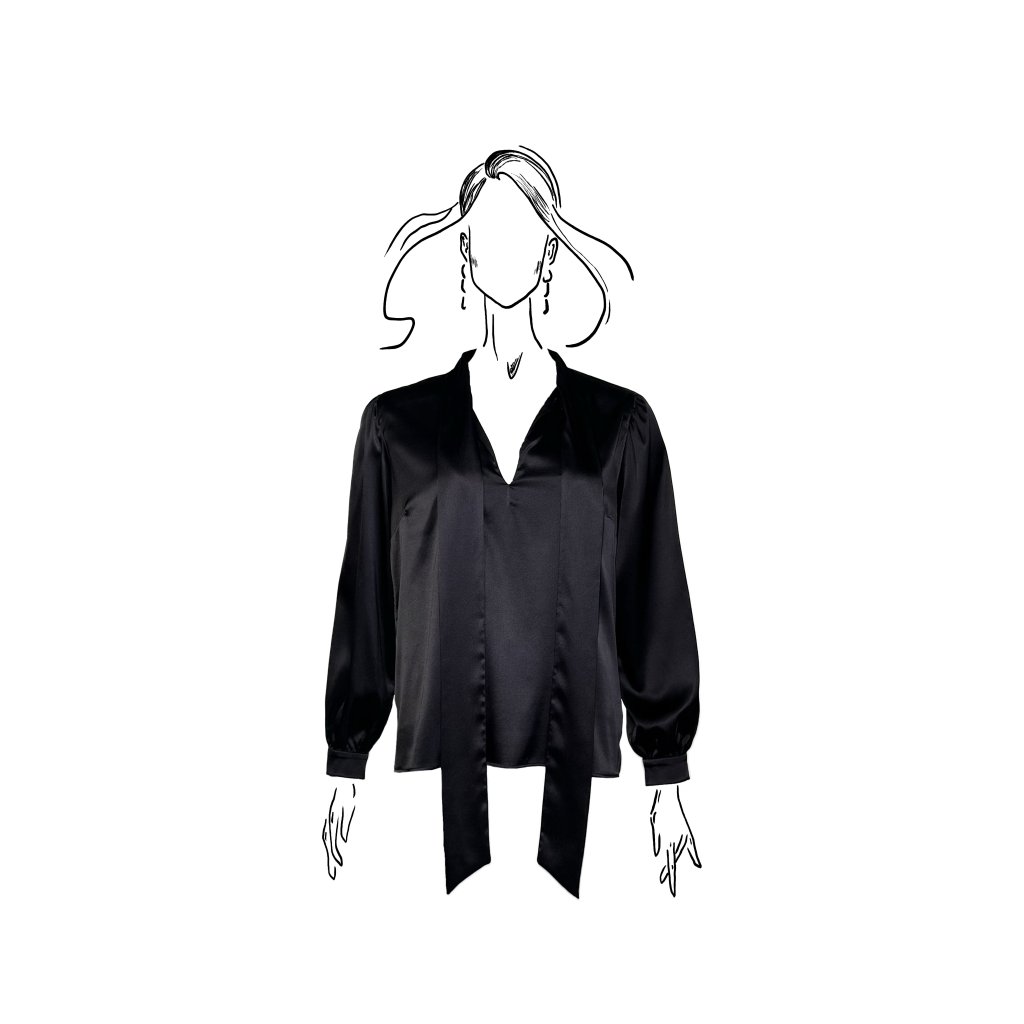 Dlouhé rukávy s jemným zapínáním na manžetách dodávají modelu klasickou eleganci, zatímco saténový materiál přináší lesk a výjimečný komfort. Halenka je dostupná ve dvou barevných provedeních – ikonické černé a čisté bílé, které podtrhují nadčasový charakter celé kolekce.