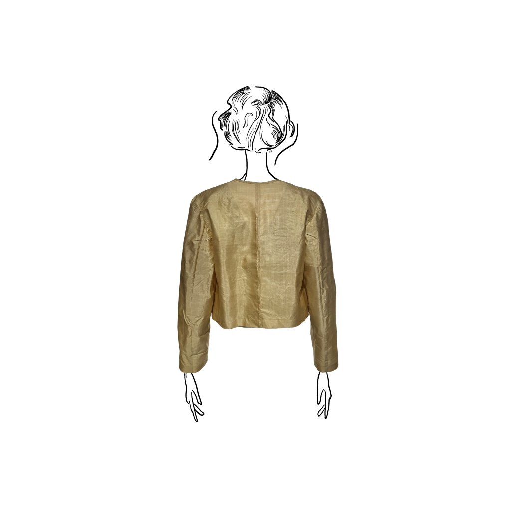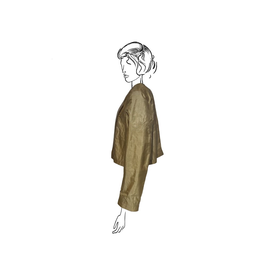 Sako je dostupné v zlatavě-béžovém odstínu, který podtrhuje přirozený charakter materiálu. Lze jej nosit samostatně jako výrazný solitér, nebo využít jako lehký vrchní prvek pro vrstvení přes halenky, topy či šaty.