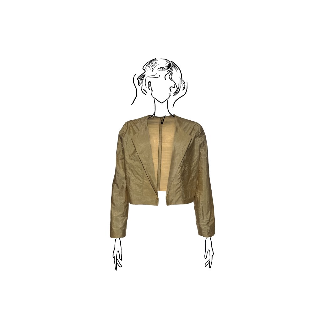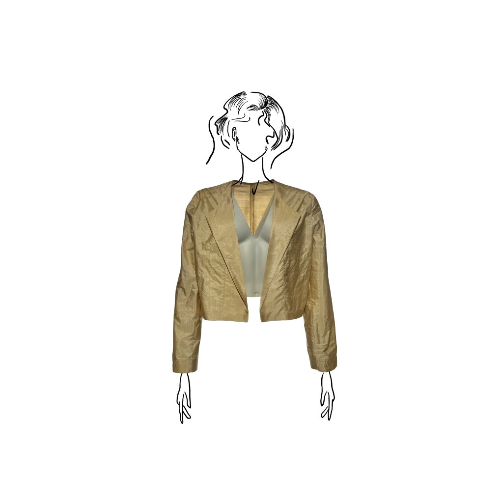 Materiál má při dotyku jemně papírový charakter, je mimořádně lehký a vzdušný. Při nošení vytváří jedinečný pocit, jako byste měla na sobě jen tenký hedvábný list. Právě tato specifická struktura a lehkost dělají z tohoto saka naprosto originální model určený pro klientky, které oceňují řemeslo, netradičnost a autenticitu.